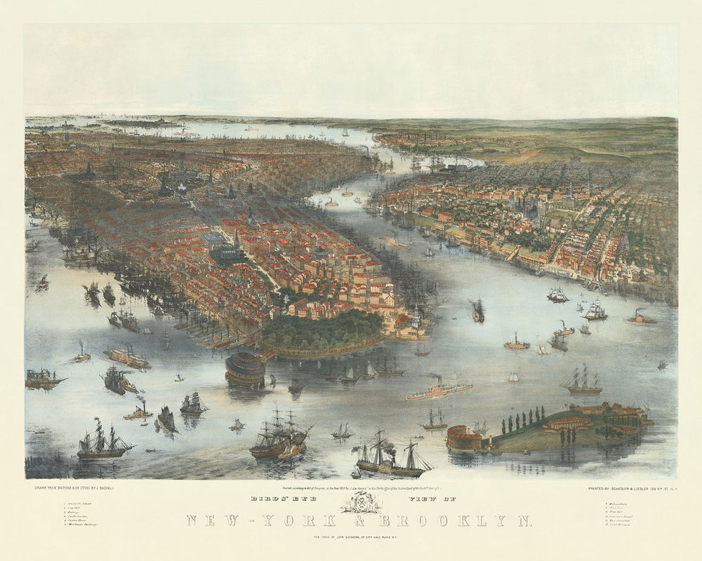 Die Karte ist reich an Details und zeigt bemerkenswerte Viertel, Sehenswürdigkeiten und Wasserstraßen, die New York und Brooklyn definieren. Der noch in den Kinderschuhen steckende Central Park deutet auf die grüne Oase hin, die er inmitten der Zersiedelung der Stadt werden würde. Die Battery, Castle Clinton und Governor's Island sind prominent ausgestellt und unterstreichen die strategische Bedeutung des New Yorker Hafens. Brooklyn zeigt erste Anzeichen der Urbanisierung, wobei Williamsburg und Brooklyn Heights bemerkenswert detailliert skizziert sind. Die Darstellung des East River, des Hudson River und des Harlem River auf der Karte verdeutlicht nicht nur die natürlichen Grenzen dieser Städte, sondern auch die entscheidende Rolle, die Wasserstraßen für ihre Entwicklung und Wirtschaft spielten.
