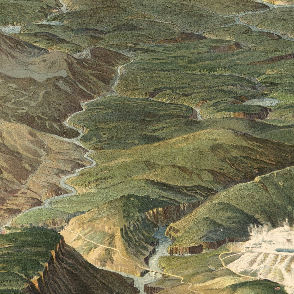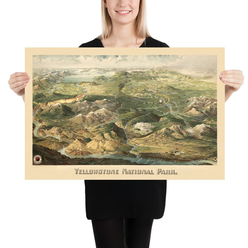 Insgesamt ist diese Karte ein schönes und historisch bedeutendes Kunstwerk, das eine einzigartige Perspektive auf den Yellowstone-Nationalpark bietet. Sie ist eine wertvolle Ressource für jeden, der sich für die Geschichte des Parks, die Geschichte der Kartografie oder die Geschichte des amerikanischen Westens interessiert.