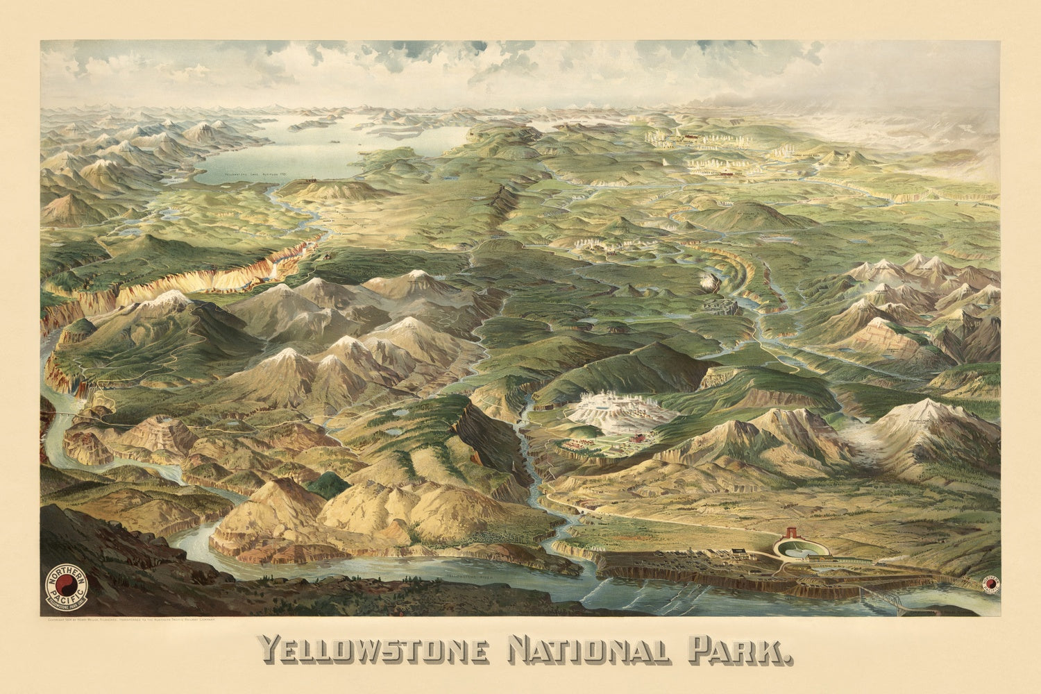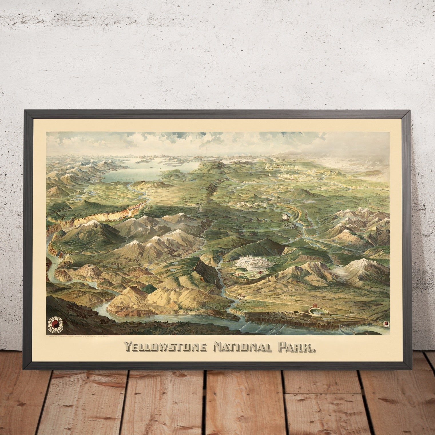 Diese 1904 veröffentlichte bildliche Karte des Yellowstone-Nationalparks, ursprünglich herausgegeben von Henry Wellge und der Northern Pacific Railway Company, ist ein beeindruckendes und historisch bedeutendes Stück Kartografie. Die Karte bietet eine detaillierte Vogelperspektive auf den Park und zeigt seine natürlichen Wunder sowie von Menschenhand geschaffene Wahrzeichen. Sie ist eine wertvolle Ressource für Historiker, Kartografen und alle, die sich für die Geschichte des amerikanischen Westens interessieren.