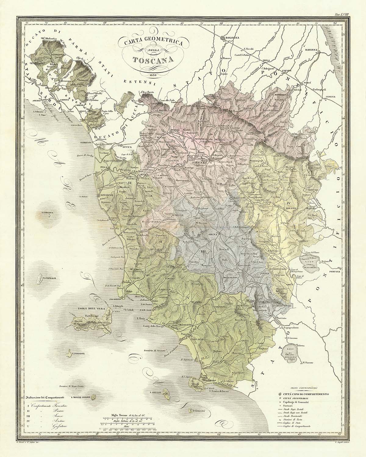 Marmocchi divides the duchy into five departments—Florence, Pisa, Siena, Arezzo, and Grosseto—each expressed in distinct color, their boundaries articulated with crisp, confident line. The departmental capitals anchor their regions: Florence at the heart of the interior, Pisa and Livorno marking the maritime axis to the west, Siena commanding the undulating center, Arezzo standing toward the eastern hill country, and Grosseto presiding over the southern reaches. Within these fields, the map names major towns and villages with disciplined typography: Prato and Empoli in the Florentine orbit, Livorno alongside Pisa, and the provincial centers themselves. The result is an administrative portrait that reads at a glance yet rewards close study, with the legend clarifying every symbol in the cartographer’s visual grammar.