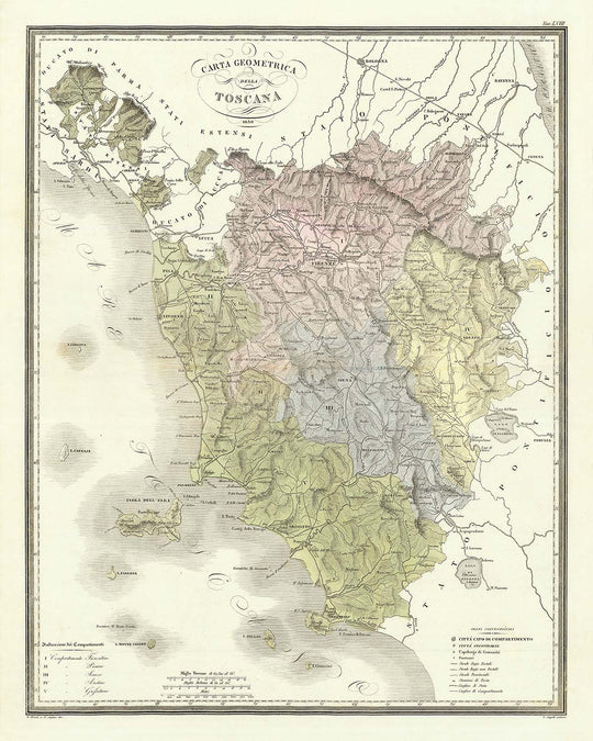 • Color-coded regions, indicating different departments of Tuscany