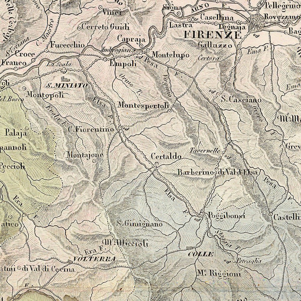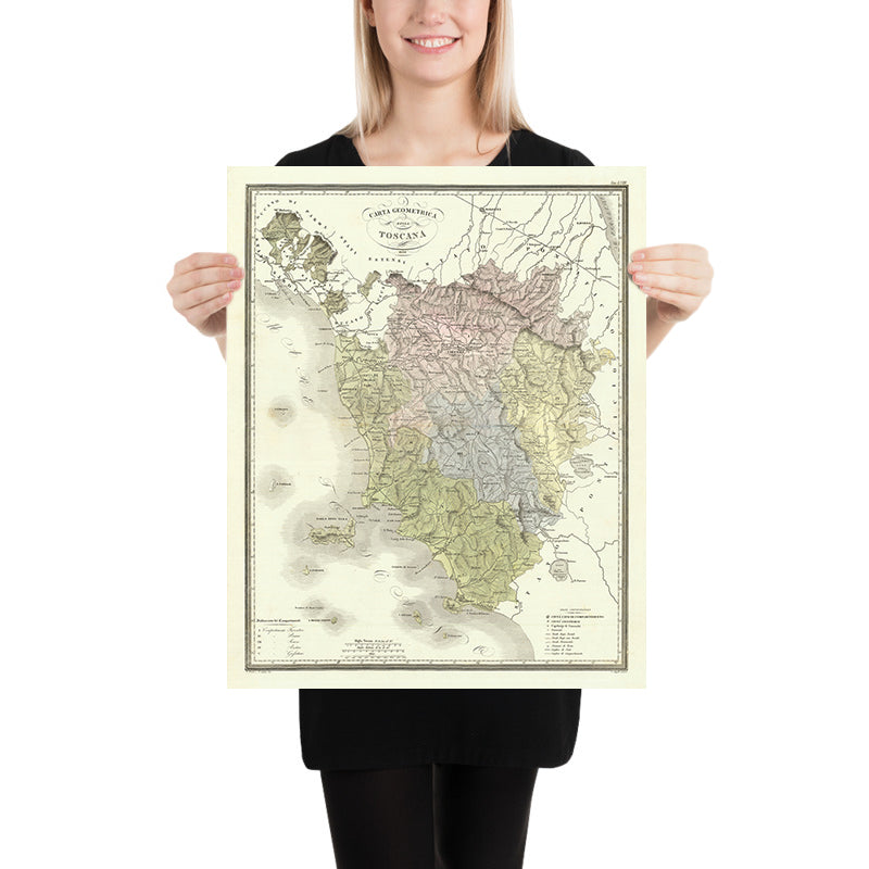 Francesco Costantino Marmocchi’s cartography is celebrated for its intricate detail and disciplined use of color, and this 1839 work distills those qualities into a lucid synthesis of science and statecraft. Every element serves a purpose: color‑coded departments to register jurisdiction; calibrated tints to articulate relief and coasts; a legend that decodes symbols for towns, rivers, and other features. Created in the final decades before Italian unification, it stands as a primary witness to the governance and territorial organization of the Grand Duchy of Tuscany under Habsburg administration. For historians, geographers, and discerning viewers alike, it offers a text to be read as much as an image to be admired—an enduring key to Tuscany’s nineteenth‑century order.