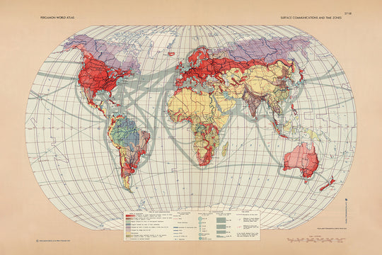 Alte Infografik-Karte der Weltoberflächenkommunikation, 1967: Schifffahrtsrouten, Luftverkehrsrouten, Zeitzonen