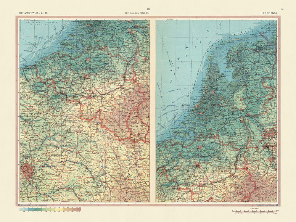 Der Stil der Karte ist politisch und physisch detailliert und präsentiert eine gründliche Darstellung der politischen Grenzen und physischen Merkmale dieser Nationen. Die Karte umreißt sorgfältig die Grenzen von Provinzen, Bezirken und Städten und zeigt gleichzeitig die natürliche Landschaft. Berge, Flüsse und andere bedeutende natürliche Phänomene sind genau dargestellt, was ein umfassendes Verständnis der physischen Geografie dieser Nationen ermöglicht. Der Stil der Karte dient somit als Fenster in die Vergangenheit und ermöglicht es den Betrachtern, den geografischen und politischen Kontext von Belgien, Luxemburg und den Niederlanden in der Mitte des 20. Jahrhunderts zu verstehen.
