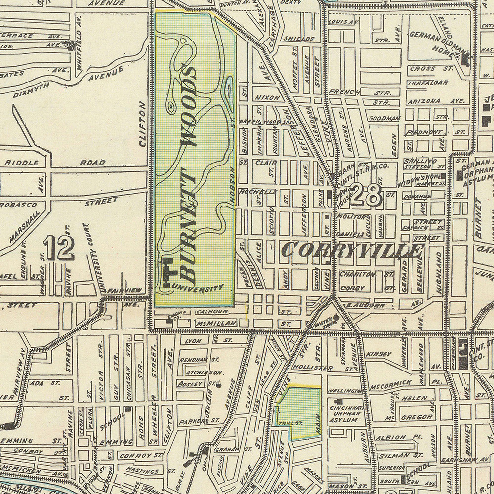 Transportation threads through the plan with commanding influence. Rail lines lace the riverfront and the Mill Creek corridor, converging near Western and Central Avenues, while arterial roads radiate to the hills: Reading Road, Madison and Montgomery Roads to the east; Clifton Avenue toward the university heights; Harrison and Glenway Avenues spanning the western terraces; Winton Road and North Bend Road reaching the northwestern neighborhoods; Blue Rock Road marking the approach to river-valley communities. College Hill Avenue and Clifton Avenue signal the incorporation of formerly outlying suburbs, and clear city boundaries document Cincinnati’s expanding jurisdiction. In its aggregate, the map shows how steel rails and macadamized roads anchored neighborhoods to the urban core, binding commerce, labor, and daily life.
