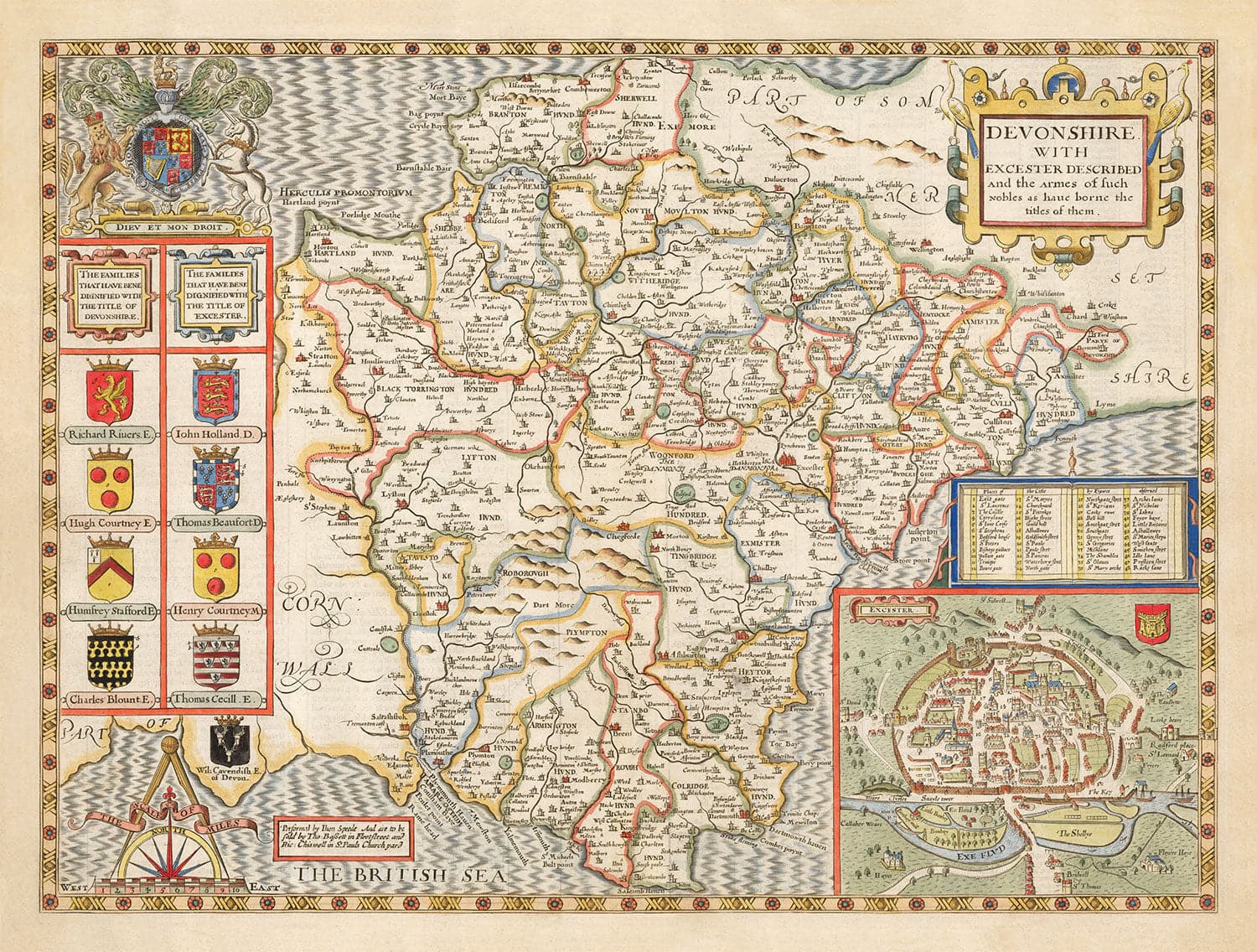 In der unteren rechten Ecke befindet sich eine detaillierte Gravur von Exeter, damals (und immer noch) die Hauptstadt dieser alten Grafschaft.