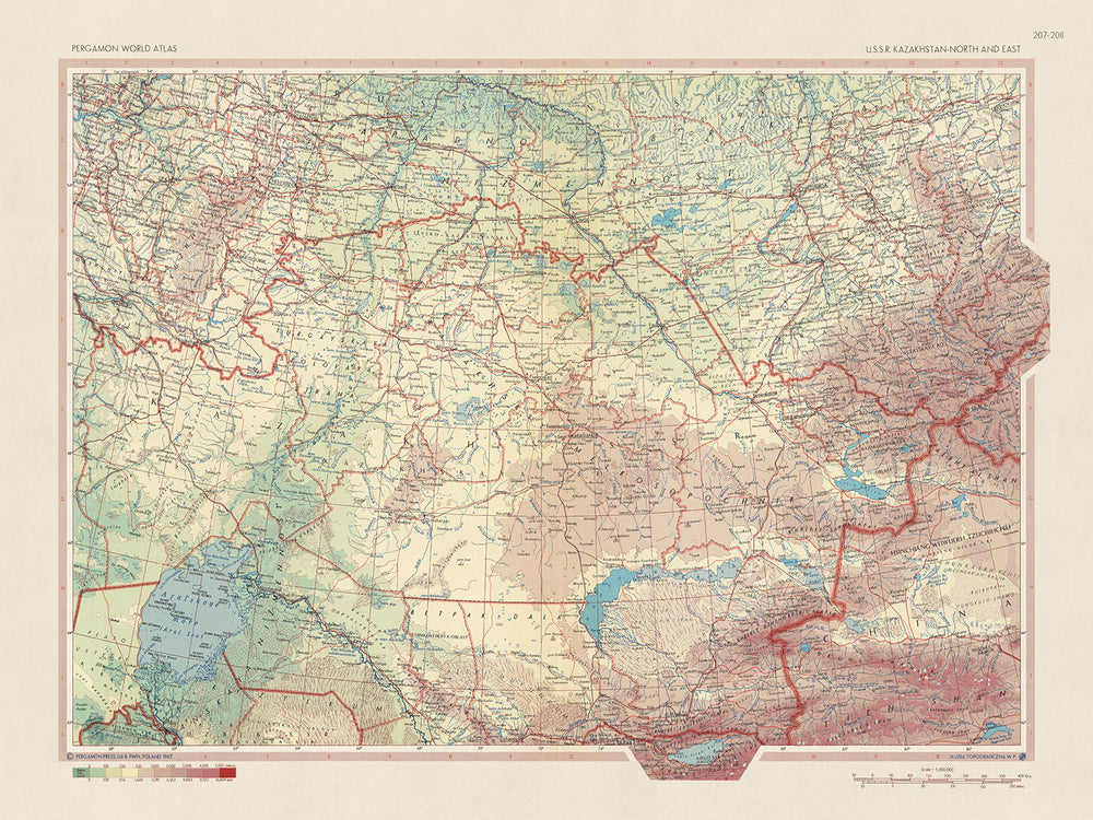 Diese Karte von 1967 der nördlichen und östlichen Regionen der UdSSR in Kasachstan, veröffentlicht vom Topographiedienst der polnischen Armee, ist eine detaillierte politische und physische Karte, die einen umfassenden Überblick über die Geographie und die politische Landschaft der Region bietet. Die Karte deckt fast ganz Kasachstan ab, mit Ausnahme der westlichsten Teile des Landes.