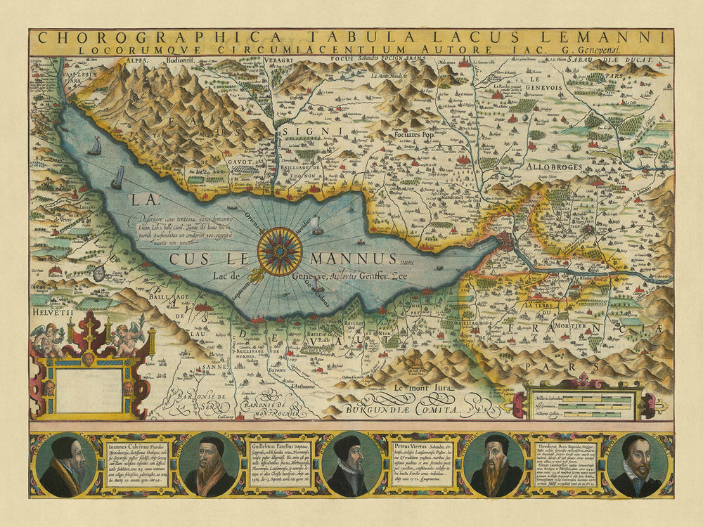 Im Herzen dieser Karte liegt eine einzigartige Hommage an die Lichtgestalten der protestantischen Reformation. Porträts von Johannes Calvin, Wilhelm Farel, Pierre Viret, Theodore Beza und Simon Goulart schmücken ihre Oberfläche, jedes ein Zeugnis für die bleibende Wirkung ihres Wirkens und Glaubens. Diese Persönlichkeiten, die entscheidend zur Verbreitung der Reformation in Genf und darüber hinaus beitrugen, sind in diesem ersten Zustand der Karte verewigt, ein Merkmal, das exklusiv für diese Ausgabe ist.