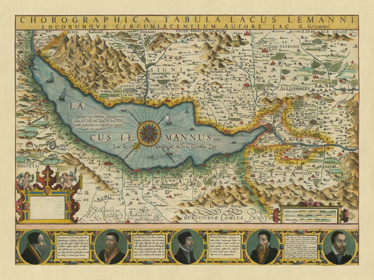 Tauchen Sie ein in das reiche Gewebe der Geschichte mit dem Lacus Lemanus, einer seltenen und exquisiten Karte, die Sie in die Region des Genfersees während der entscheidenden Ära der protestantischen Reformation transportiert. Mit akribischer Detailgenauigkeit vom renommierten flämischen Kartografen Jodocus Hondius im Jahr 1606 erstellt, ist diese Karte nicht nur ein Navigationswerkzeug, sondern auch eine Hommage an die intellektuelle und spirituelle Revolution, die Europa neu gestaltete.