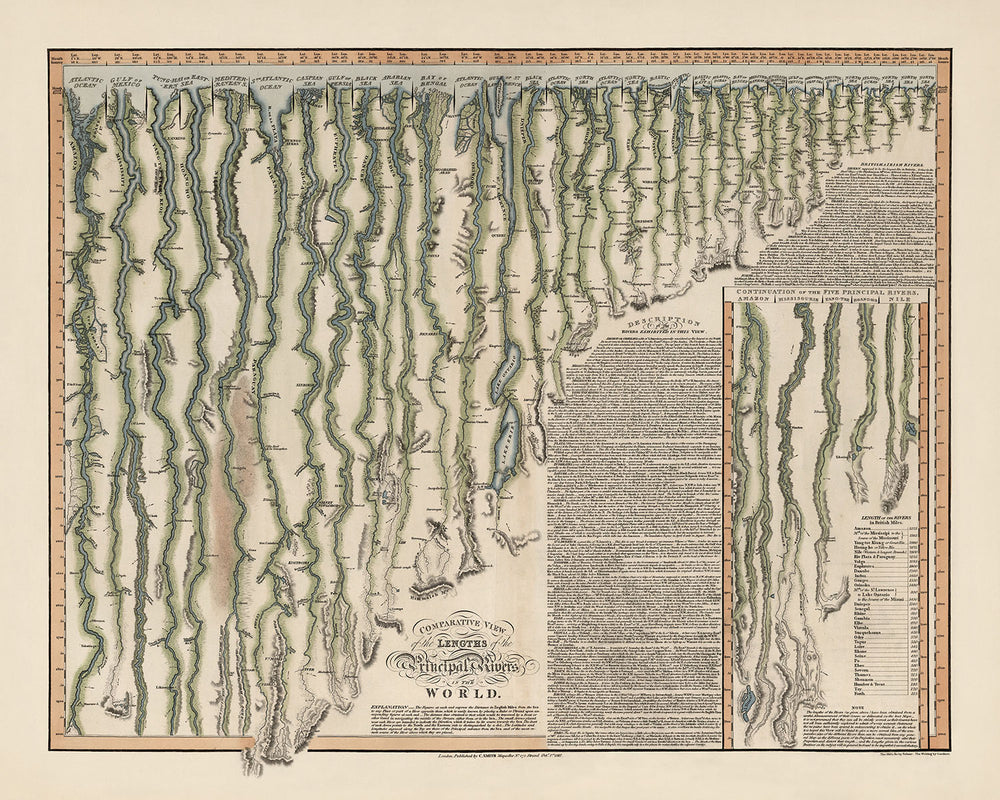 C. Smith, der Kartenmacher, war eine herausragende Figur in der frühen Kartographie des 19. Jahrhunderts, bekannt für seine detaillierten und informativen Karten. Seine Arbeit spiegelt ein tiefes Verständnis der Geografie sowie ein Engagement für Genauigkeit und Klarheit wider. Diese Karte ist ein Zeugnis seiner Fähigkeiten und Hingabe und bietet eine einzigartige Perspektive auf die wichtigsten Flüsse der Welt und ihre Bedeutung in der globalen Geografie.