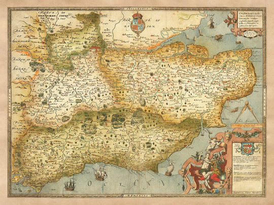 Dies ist die erste gedruckte Karte von Südostengland, erstellt vom Vater der englischen Kartografie, Christopher Saxton. Sie wurde 1575 veröffentlicht, als Königin Elisabeth I. regierte.