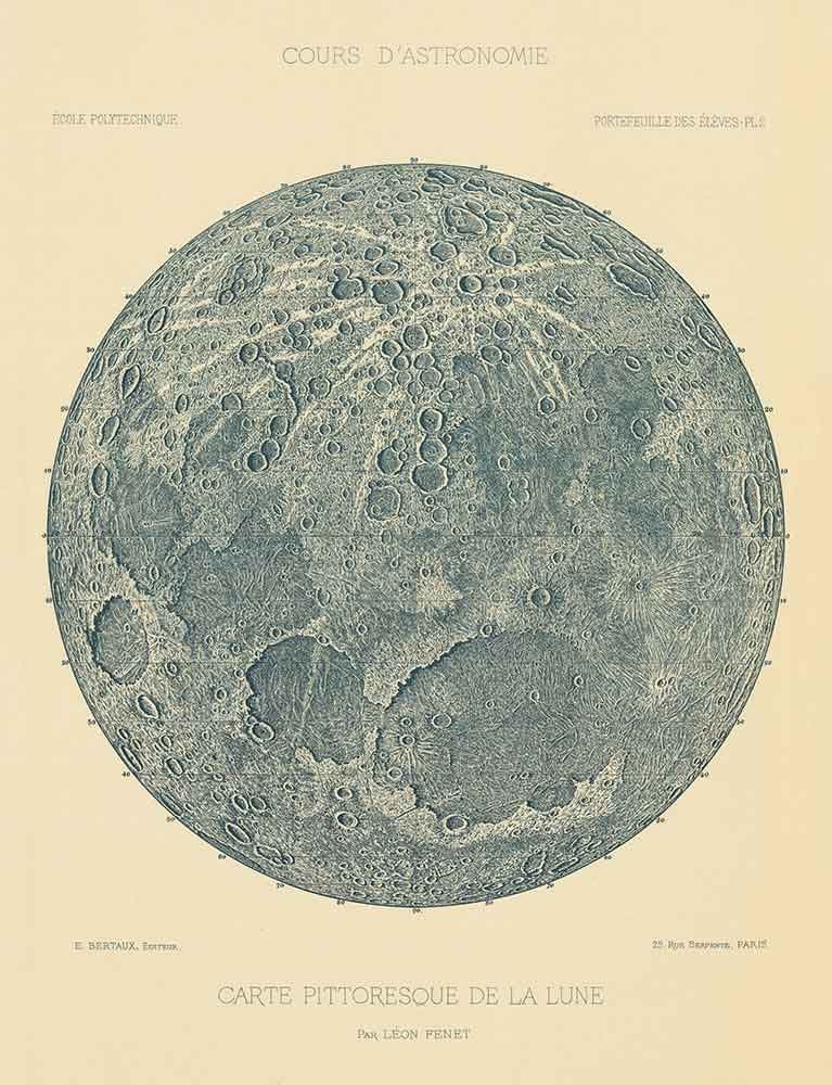 Eine wahrhaft schöne Darstellung des Mondes, ursprünglich 1888 von Leon Fenet veröffentlicht und der Astronomischen Gesellschaft von Frankreich präsentiert.