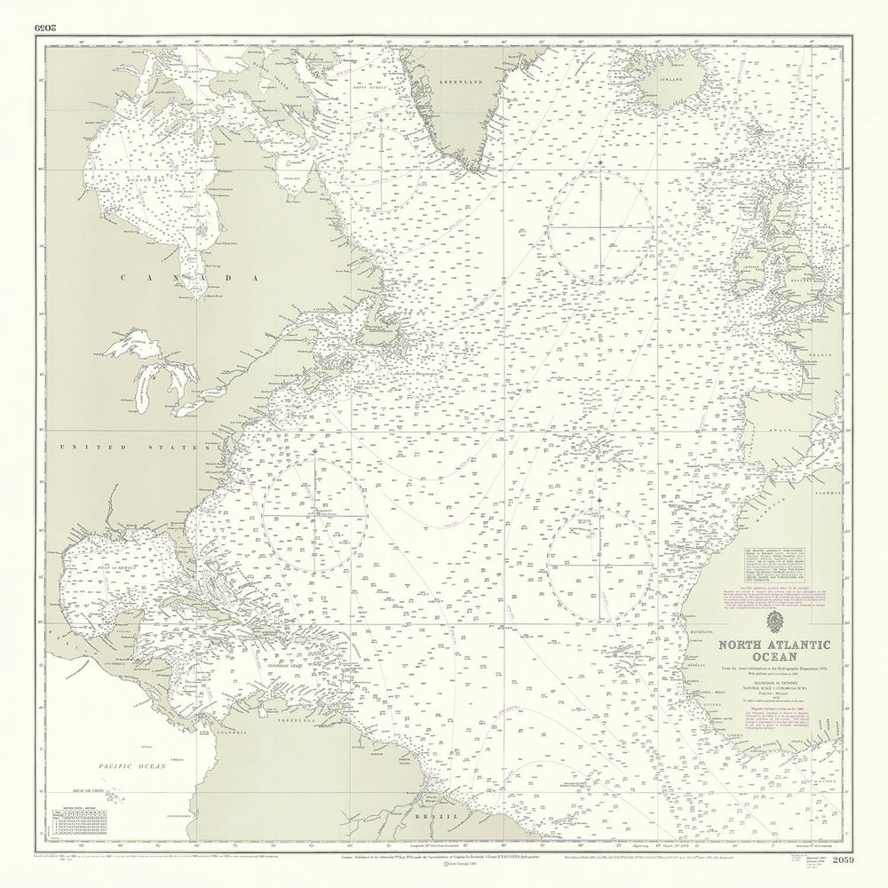 As a product of the British Admiralty—whose Hydrographic Office set the global standard for sea charts since the early nineteenth century—this edition embodies a cartographic language prized for its reliability and restraint. It bridges eras: conceived in the age of sail and steam, refined through the rise of modern merchant fleets, and still relevant on the cusp of satellite navigation. By uniting measured depths, codified symbols, and the accumulated habits of ocean travel, it offers not just a record of the North Atlantic but a framework for mastering it—linking the Atlantic coasts of Canada and the United States to Greenland, Bermuda, and the Azores in one coherent, navigable whole.