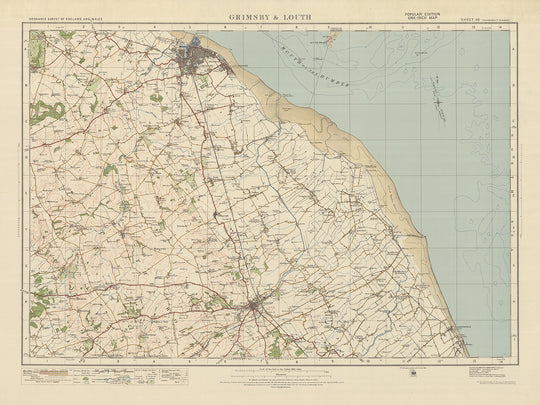 Diese sorgfältig erhaltene alte Karte mit dem Titel „Blatt 40 – Grimsby & Louth“ ist ein bemerkenswertes Stück aus der 1-Zoll-Ausgabe „Popular“ von Ordnance Survey, England und Wales, veröffentlicht im Jahr 1925. Die Karte zeigt die historische Grafschaft Lincolnshire mit besonderen Hervorhebungen die Städte Grimsby und Louth sowie mehrere andere faszinierende Orte. Bitte beachten Sie, dass einige moderne Städte zwar möglicherweise nicht auf dieser Karte dargestellt sind, sie jedoch einen interessanten Einblick in die Vergangenheit bietet, in der einige Siedlungen möglicherweise unter früheren Namen erscheinen.
