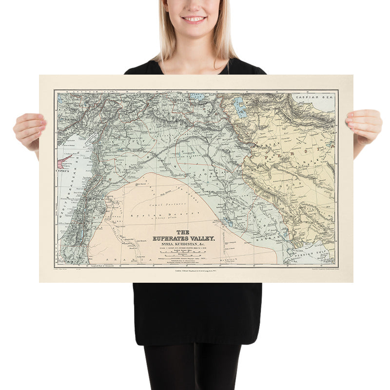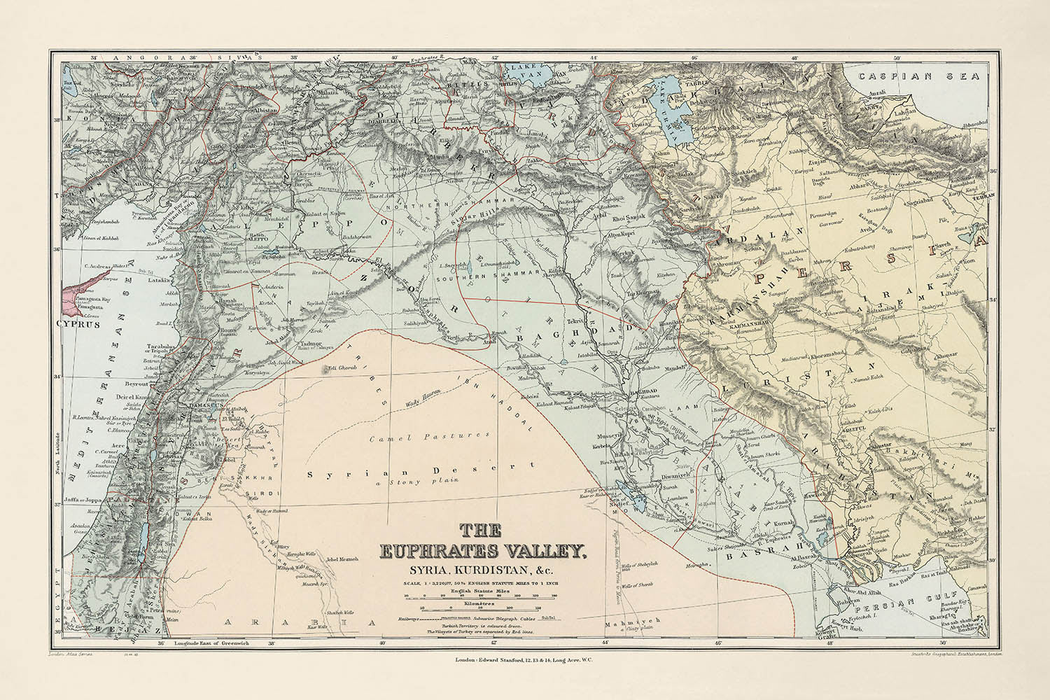 Old Ottoman Map of Euphrates Valley by Stanford, 1904: Aleppo, Damascus, Baghdad, Mosul, Kurdistan