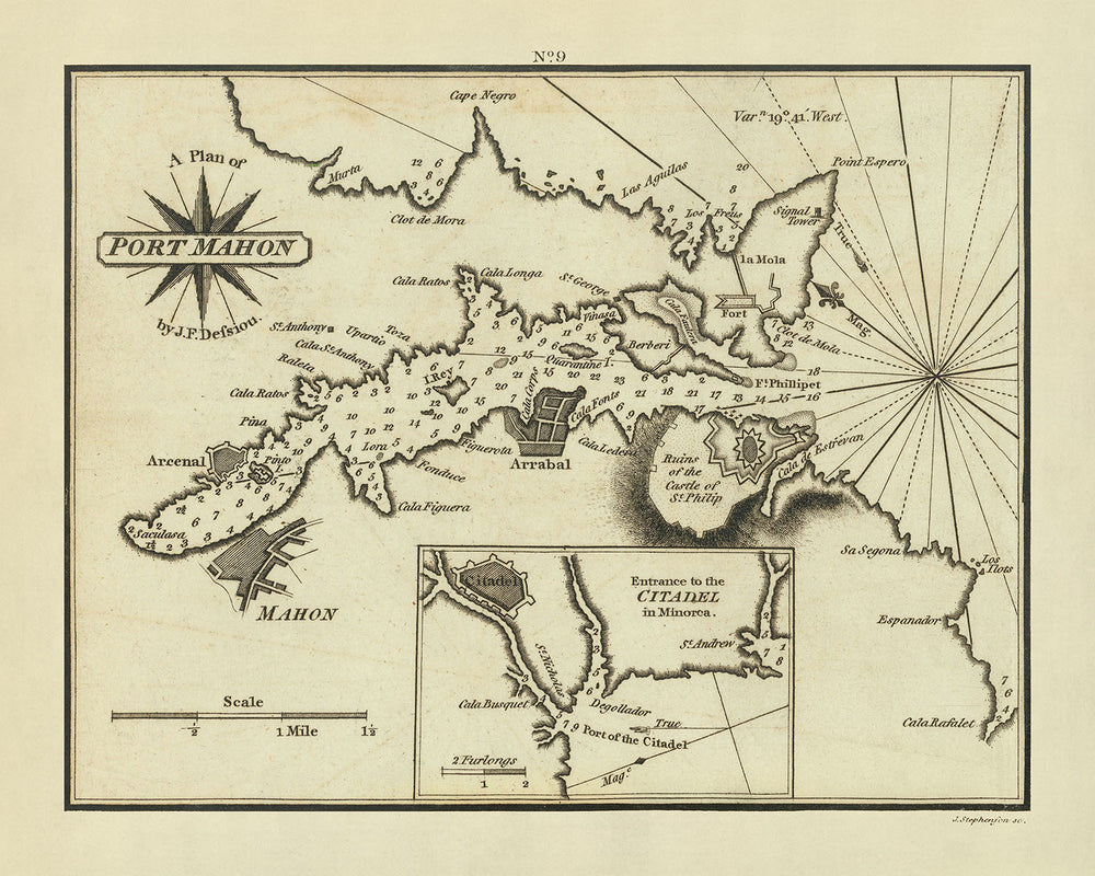 Was die geografische Abdeckung betrifft, bietet die Karte eine detaillierte Ansicht der Küstengebiete und hebt wichtige Orte wie Kap Negro, Punkt Espero und das Lazaretto hervor. Sie markiert auch bedeutende große Strukturen wie Fort St. Philip und die Zitadelle, die eine entscheidende Rolle in der Militärgeschichte der Region spielten. Die Einbeziehung dieser Elemente macht die Karte nicht nur zu einem Navigationshilfsmittel, sondern auch zu einem historischen Dokument, das die geopolitischen Dynamiken des Mittelmeers zu dieser Zeit widerspiegelt.