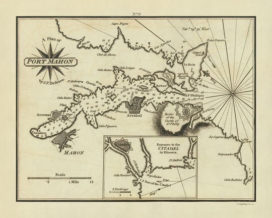 Die Karte ist mit Nordost oben ausgerichtet und enthält einen großen Ausschnitt des Eingangs zur Zitadelle, einem entscheidenden Merkmal zum Verständnis der Verteidigungsmechanismen der damaligen Zeit. Sie dokumentiert akribisch verschiedene topografische Merkmale, Ankerplätze und Tiefenmessungen, die für die Navigation unerlässlich sind. Die bildlichen Darstellungen der Stadt und der Festung tragen nicht nur zur ästhetischen Anziehungskraft der Karte bei, sondern dienen auch als informatives Werkzeug, das Einblicke in die architektonische und militärische Landschaft von Port Mahon in dieser Ära bietet.