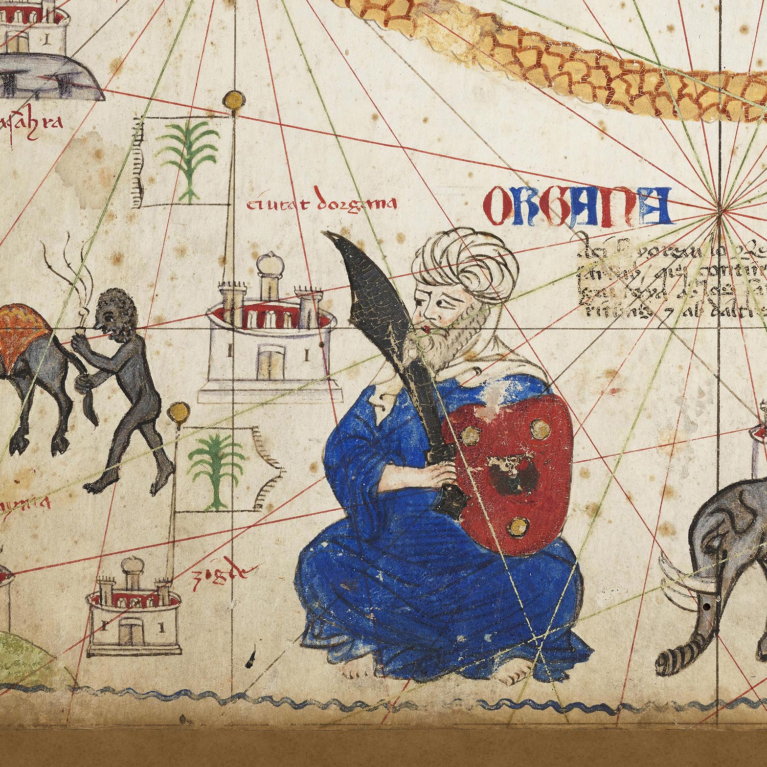 West Africa receives an unprecedented prominence. Most famously, Mansa Musa of the Mali Empire appears enthroned, gleaming orb of gold in hand, an emblem of the Niger’s great bullion and the lure of trans-Saharan caravans. Nearby polities—Kanem-Bornu, the Yoruba heartland of Ife, and coastal trade cities—anchor a network of routes that fed Mediterranean markets. Illustrations and captions detail the extraction and movement of wealth, from goldfields to salt and textiles, transforming distant rumors into legible geography. In portraying rulers, resources, and roads together, the Atlas shaped Europe’s imagination of Africa and influenced later quests for commerce, charting a world where the desert was not emptiness but a highway of exchange.