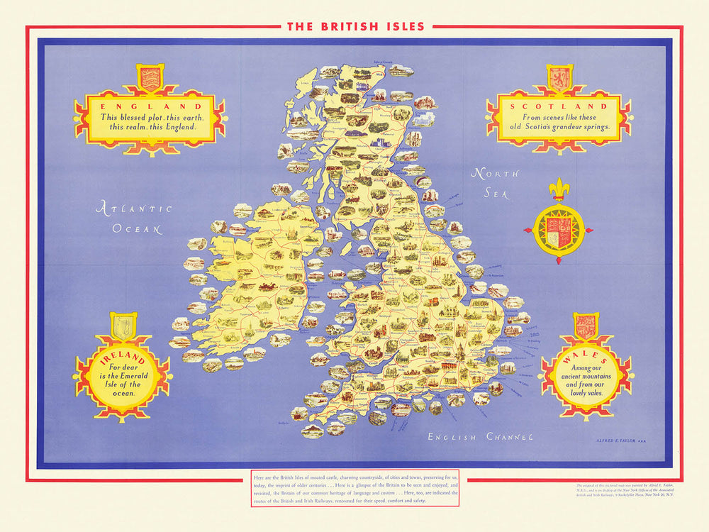 Alfred E. Taylor, bekannt für seine Fähigkeit, künstlerische Darstellung mit praktischen Informationen zu verbinden, schuf diese Karte, um die Vorstellungskraft von Reisenden weltweit zu fesseln. Sein Werk sollte die kulturelle und historische Fülle der Britischen Inseln hervorheben und eine visuelle Reise durch die Zeit bieten. Taylors Karte ist mehr als nur eine geografische Darstellung; sie ist eine Feier der historischen Bedeutung der Region und ein Aufruf, ihre vielen Wunder zu erkunden.