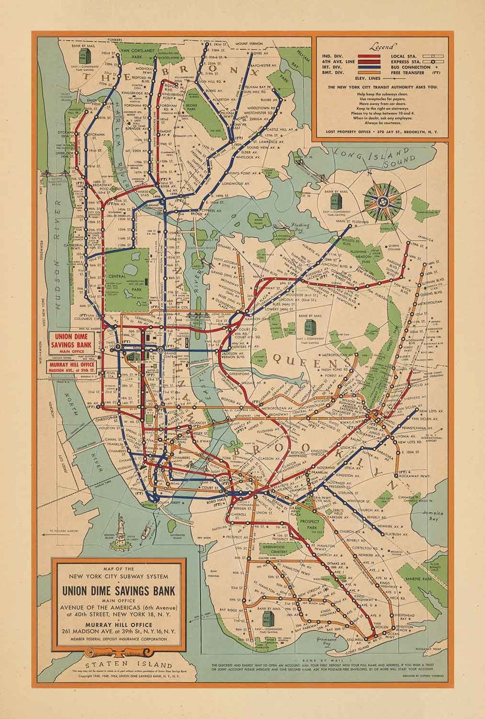 Eine faszinierende Karte des New Yorker U-Bahn-Systems, ursprünglich 1954 als Puzzle von Stephen Voorhies für die Union Dime Savings Bank veröffentlicht. Diese Karte wurde kurz nach der Vereinigung mehrerer NYC-Transportsysteme unter der öffentlichen New Yorker Verkehrsbehörde, oder MTA, wie sie heute bekannt ist, veröffentlicht.