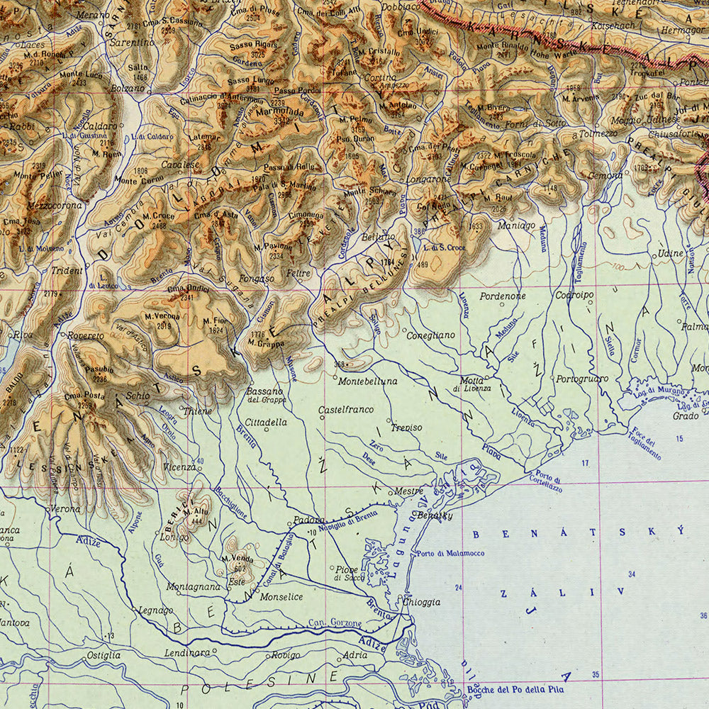 Alpy, published in 1965 by the Czechoslovak Academy of Sciences, is a masterwork of mid‑century analytical cartography. Conceived within a comprehensive military atlas, it employs the equidistant Kuzelov projection to balance spatial fidelity with strategic readability across the Alpine arc. Political boundaries are crisply delineated in color, while gradient tints, disciplined hachures, and precisely placed spot heights translate rugged relief into a legible, three‑dimensional narrative. Watercourses and lakes are articulated with hydrological clarity, and the labeling of major passes and summits invites both orientation and interpretation. Descriptive text, diagrams, and tables—hallmarks of the atlas program—underscore an ambition that is as pedagogical as it is tactical. The result captures the Alps as an integrated system of terrain, sovereignty, and movement at the very moment the Cold War sharpened Europe’s cartographic gaze.