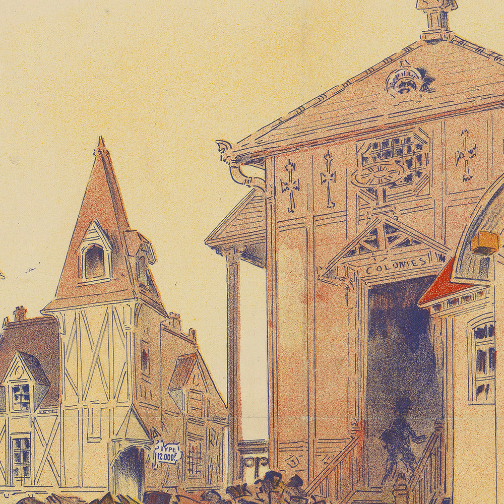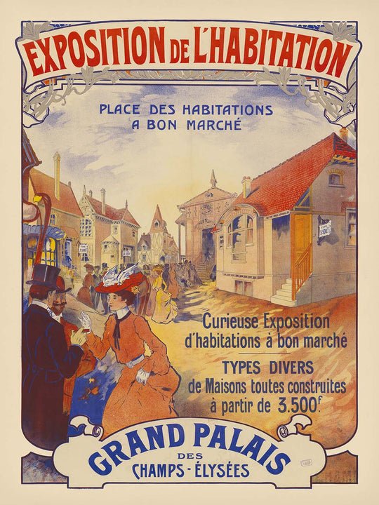 This poster’s subject is unusually compelling: a “curious exhibition of low-cost homes” presented with wit and warmth. In the early 1900s, Paris was grappling with questions of urban growth, hygiene, and access to dignified housing; exhibitions like this brought design innovation to the public. The artwork celebrates architectural variety—cottages, compact townhouses, and inventive façades—while depicting convivial crowds exploring the possibilities. It’s a rare piece of visual culture that marries social reform with showmanship, making it especially meaningful for lovers of architecture, planning, and Parisian history.