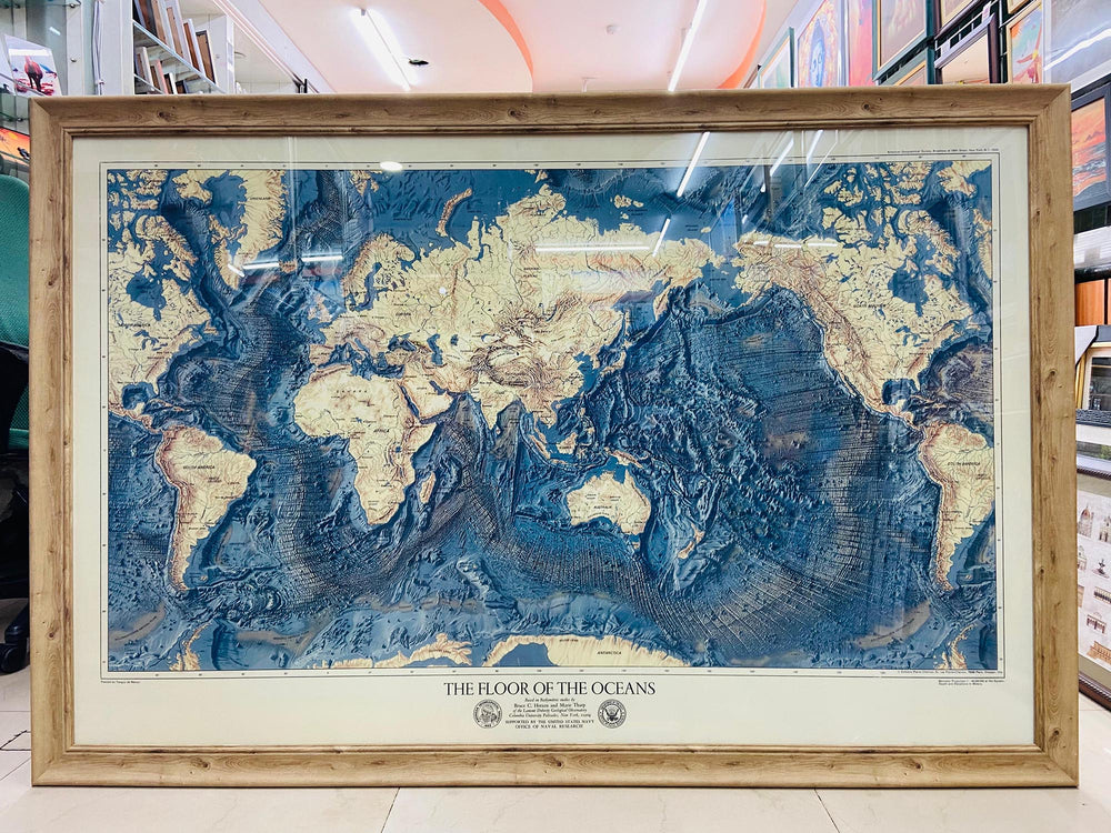 Diese wunderbare alte Karte der Topografie des Meeresbodens und des Landreliefs der Welt wurde ursprünglich 1976 veröffentlicht. Sie wurde von der US Navy erstellt.