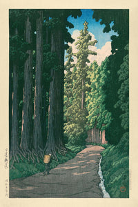 "Der Weg nach Nikko" von Hasui Kawase ist ein faszinierender Holzschnitt, der 1935 geschaffen wurde. Hasui Kawase, eine gefeierte Figur der Shin-Hanga-Bewegung in Japan, ist bekannt für seine Landschaftsdrucke, die die Schönheit der ländlichen und städtischen Landschaften des frühen 20. Jahrhunderts in Japan einfangen. Dieses besondere Kunstwerk zeigt wunderschön den Weg nach Nikko, einem Ort, der für seine historische und kulturelle Bedeutung bekannt ist, berühmt für seine ruhigen Landschaften und traditionelle Architektur.