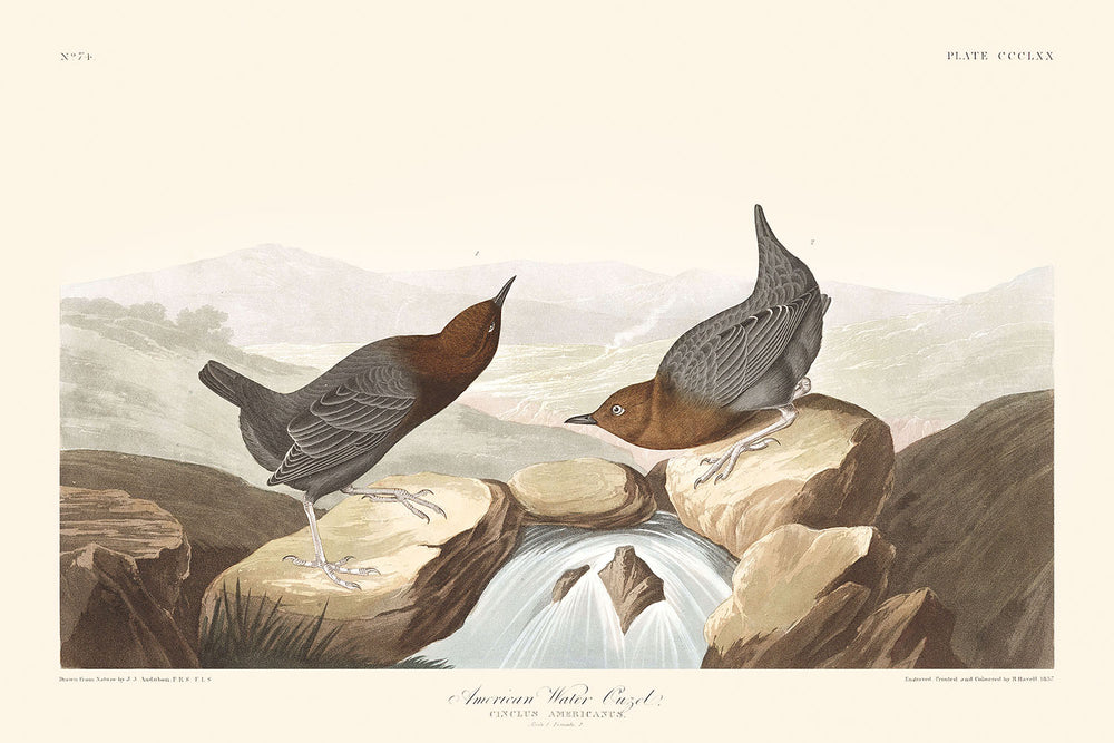 El American Water Ouzel, publicado por primera vez en 1827, es una exquisita ilustración de John James Audubon de su célebre obra, The Birds of America. Captura la gracia y belleza del American Water Ouzel con meticuloso detalle, mostrando la habilidad inigualable de Audubon en el arte ornitológico.