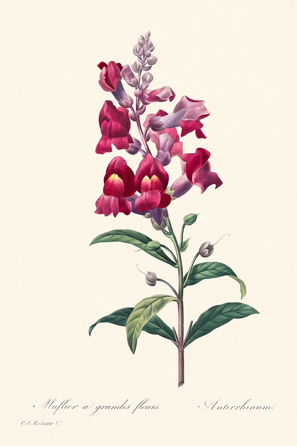 Anterinum, publicada por primera vez en 1827, es una cautivadora ilustración botánica del reconocido artista Pierre-Joseph Redouté, a menudo considerado uno de los mejores ilustradores botánicos de todos los tiempos. Redouté dedicó gran parte de su carrera a pintar la exquisita flora del Château de Malmaison a instancias de Josefina Bonaparte, esposa del general Napoleón. Nacido en Bélgica, el ilustre viaje de Redouté en el arte comenzó como tutor de pintura de María Antonieta, lo que finalmente lo llevó a su prolífico trabajo sobre las diversas flores del Château de Malmaison a partir de 1798, donde elaboró más de 2100 obras maestras botánicas que mostraban más de 1800 especies distintas.