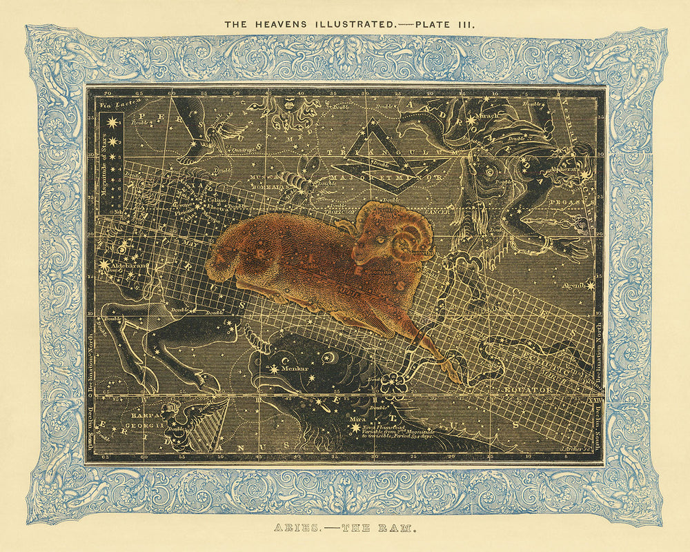 Ahora, por primera vez en casi 200 años, puedes poseer una impresión de arte de alta calidad excepcional de "Aries, El Carnero". Restaurada y preparada por The Unique Maps Co., esta impresión puede ser personalizada y adaptada para hacerla verdaderamente única. Hecha a mano e impresa en papel mate de archivo grueso, esta impresión artística está diseñada para durar sin desvanecerse ni arrugarse durante décadas.