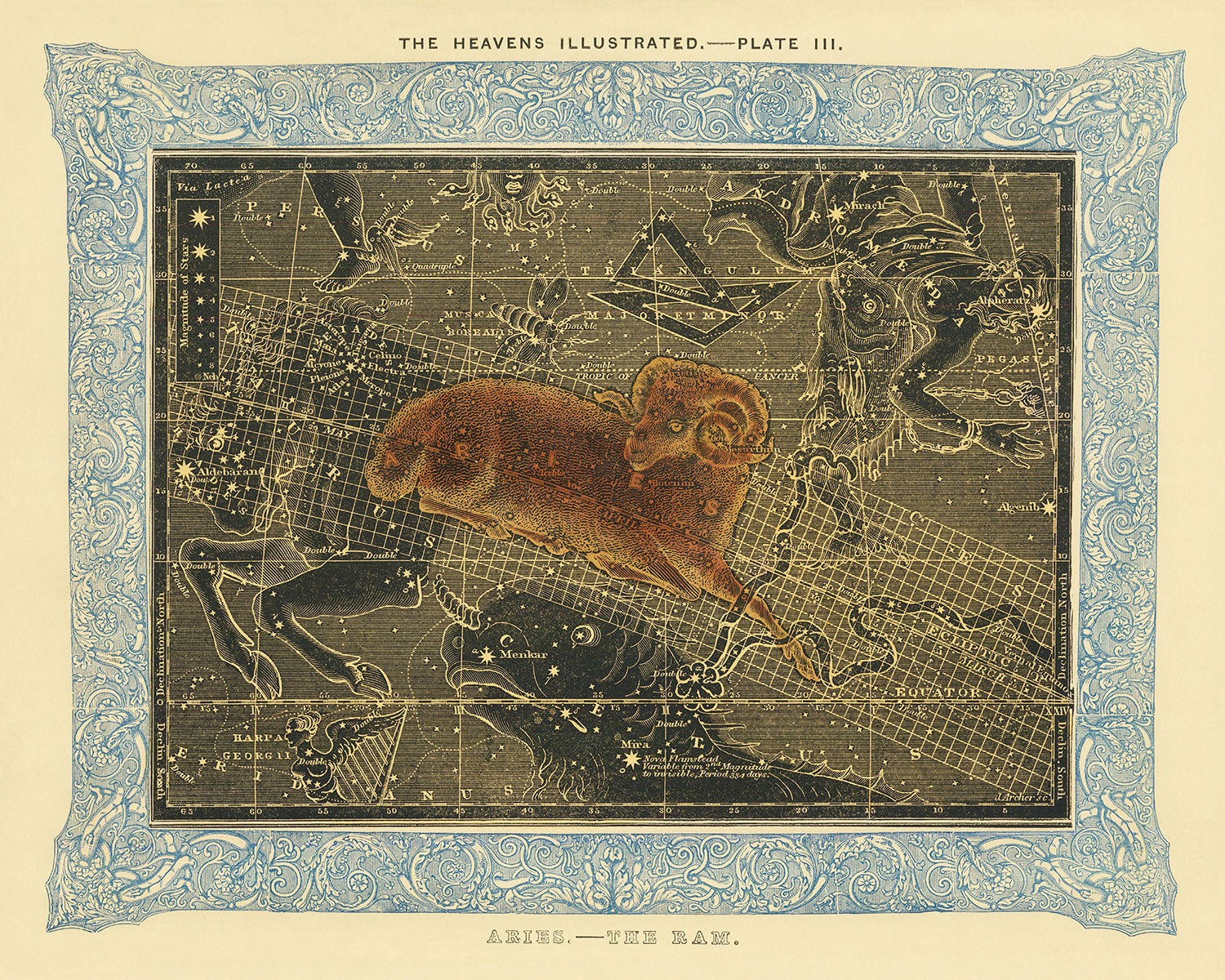 Presentando "Aries, El Carnero", un magnífico mapa estelar antiguo coloreado a mano por Duncan Bradford, publicado por primera vez en 1837. Este raro mapa celestial de la constelación de Aries es una impresionante obra histórica incluida en "Las Maravillas de los Cielos", una obra geográfica influyente de Boston.