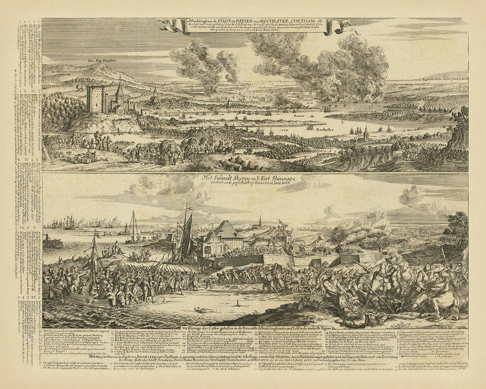Este grabado en particular ofrece una vista excepcional de las secuelas del ataque holandés a la flota inglesa anclada en Chatham Dockyard y Gillingham, representada en el panorama superior. La parte inferior del grabado muestra la exitosa captura holandesa de la isla de Sheppey, incluyendo el fortín poco defendido en Sheerness. El uso de líneas intrincadas por parte de De Hooghe y la inclusión de claves explicativas en holandés y alemán añaden capas de profundidad y contexto, haciendo que la escena cobre vida.