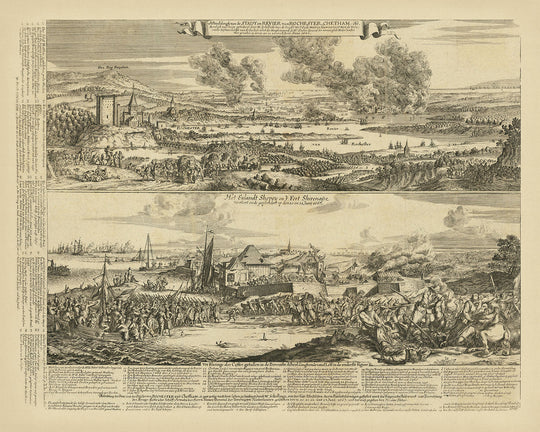 El brillo compositivo del grabado y su fidelidad histórica lo convierten en una adición convincente a cualquier colección de arte fino. La yuxtaposición del sereno paisaje fluvial contra la caótica batalla naval es una articulación visual de la guerra del siglo XVII, ejecutada con la característica finura y atención al detalle de De Hooghe.