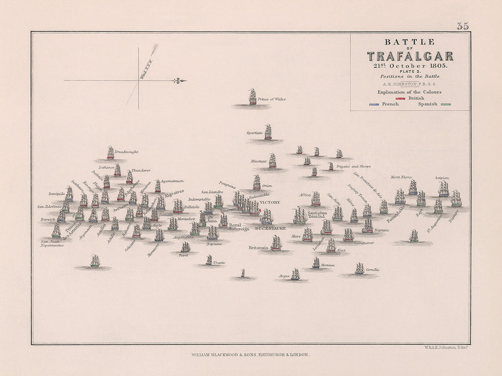 Batalla de Trafalgar: Posiciones en la Batalla por AK Johnston, 1852: Guerras Napoleónicas, Almirante Nelson
