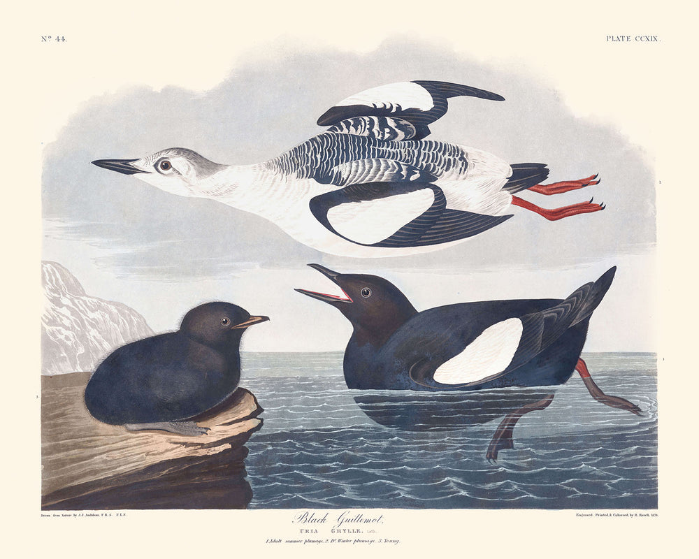 Con sus profundos negros matizados con verde y vívidos destellos rojos, la ilustración del Black Guillemot epitomiza el talento de Audubon para capturar color y detalle. Ya seas un amante del arte, un entusiasta de las aves o alguien que aprecia el arte histórico, esta pieza añade un toque de naturaleza refinada a cualquier espacio.