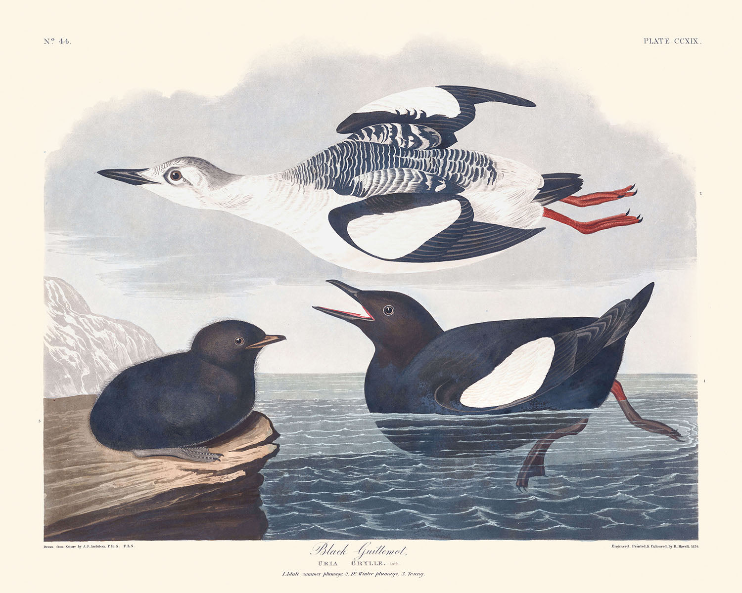 La ilustración del Black Guillemot es un testimonio del espíritu aventurero y la naturaleza meticulosa de Audubon. La narrativa que acompaña la obra describe un esfuerzo peligroso para recolectar los huevos del ave, destacando el compromiso de Audubon con el trabajo de campo y la observación personal. Esta dedicación es palpable en cada trazo de sus ilustraciones de aves, que dan vida a estos sujetos aviares de una manera que pocos artistas han igualado.