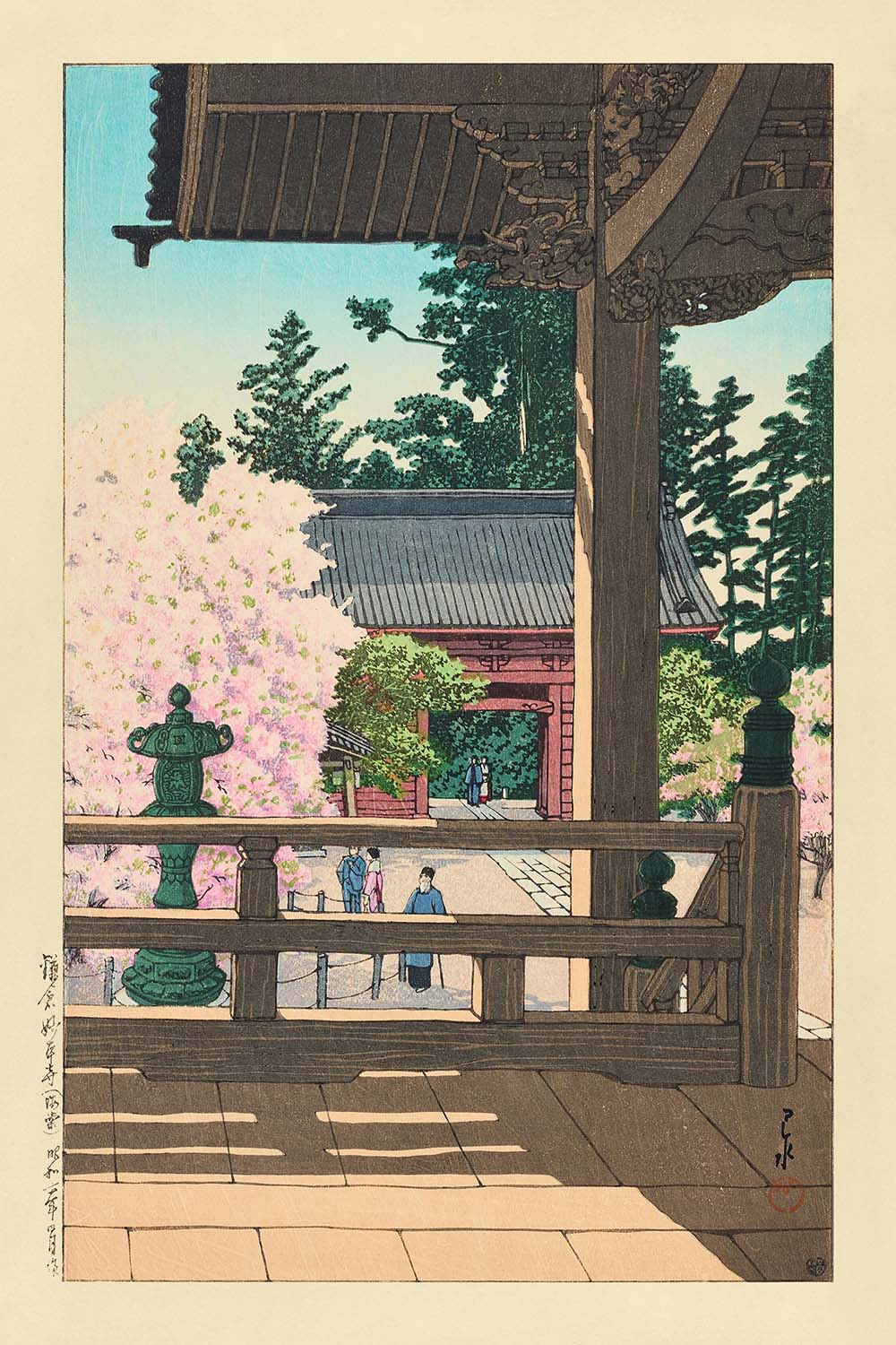 Esta impresión de xilografía en particular se destaca por su exquisita representación de los cerezos en flor que se arquean a lo largo de un camino pacífico del templo, envueltos en radiantes tonos de rosa, toques de rojo carmesí y el follaje verde y estratificado. Las ramas cargadas de flores forman un suave dosel envolvente, contrastado por una puerta torii desgastada y techos rojos inclinados, evocando una atmósfera de calma contemplativa. El uso experto de Hasui de sutiles gradientes, diferentes grosores de línea y delicados detalles texturales comunica magistralmente la poética impermanencia de las flores de cerezo, un tema recurrente en la estética japonesa.