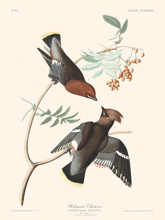 El Chatterer Bohemio, o Bombycilla garrula, es conocido por su plumaje llamativo y patrones migratorios únicos. La representación de Audubon es notable por el rico color grisáceo-marrón del pájaro que transiciona a gris ceniza y naranja marrón, con plumas primarias resaltadas en amarillo brillante y apéndices rojos similares a cera. La escena es tan informativa como estéticamente cautivadora, ilustrando la gracia natural del pájaro y los intrincados detalles con precisión.