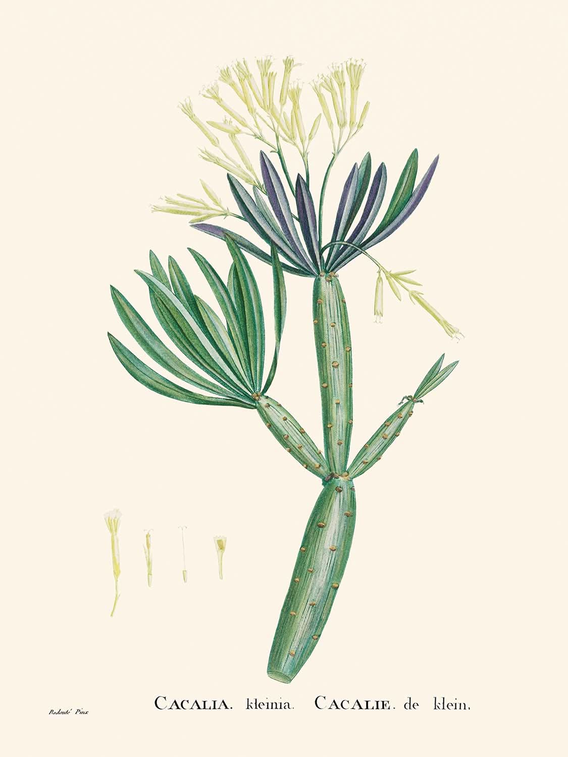 La "Planta de vela de las Islas Canarias" destaca no solo por su precisión científica, sino también por su belleza artística. Una representación exquisita de la Cacalia Kleinia, que muestra la forma única y el color vibrante de la planta. La hábil aplicación de la acuarela de Redouté resalta los verdes exuberantes y las texturas delicadas, lo que convierte a esta pieza en una verdadera celebración del arte botánico.