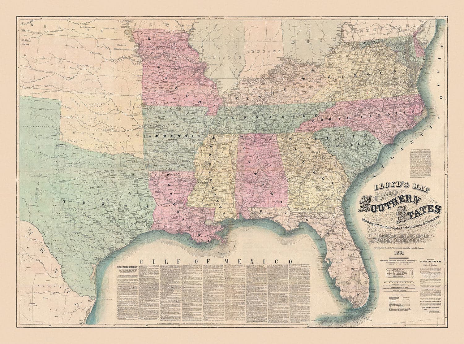 Lloyd's Map of the Southern States, 1862: Raro y antiguo mapa de la Guerra Civil de la Confederación