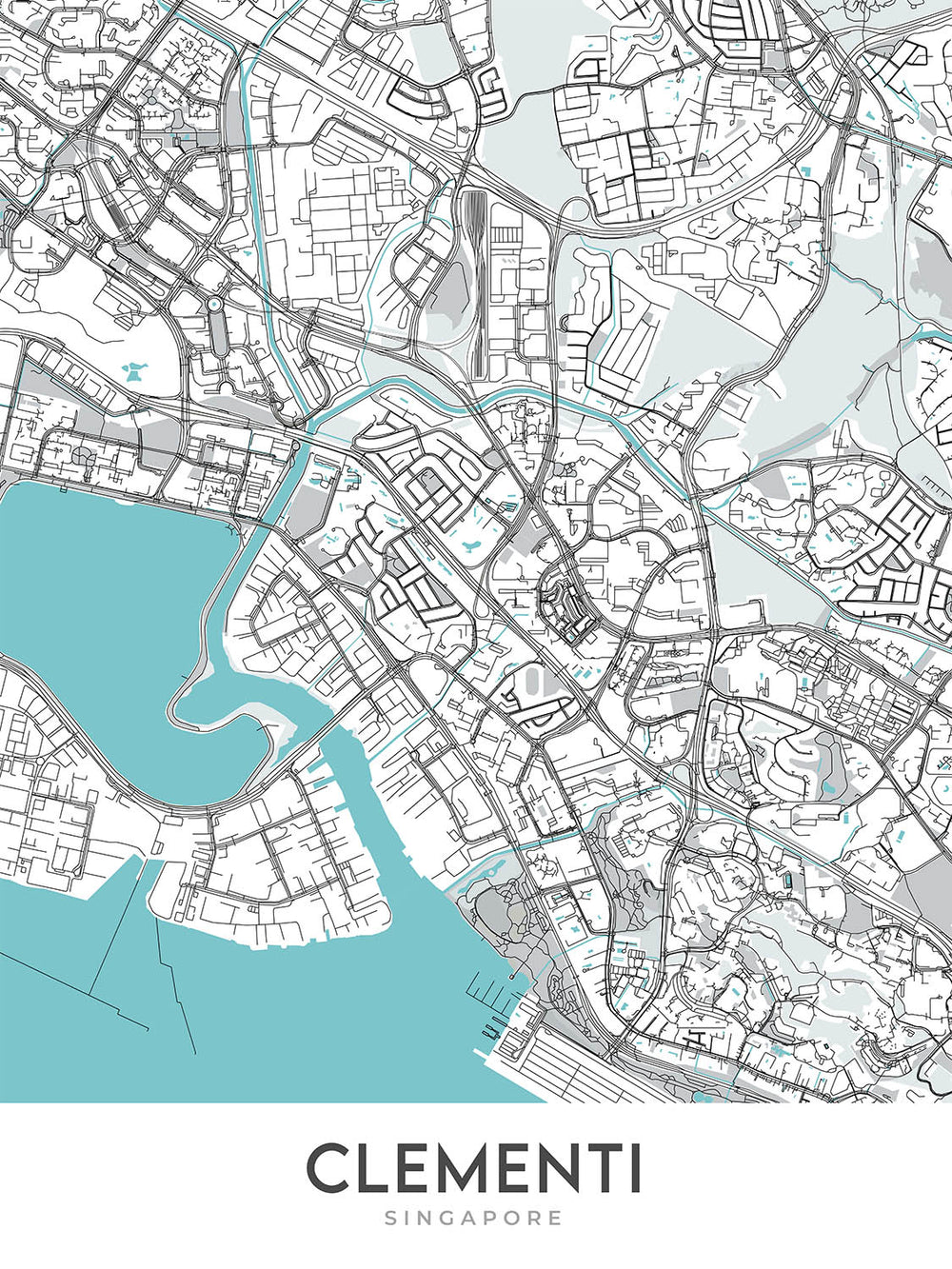 El mapa de Clementi, elaborado por The Unique Maps Co., presenta una interpretación moderna de este dinámico vecindario ubicado en la bulliciosa ciudad-estado de Singapur. Clementi, conocido por su mezcla de vida comunitaria vibrante y áreas residenciales tranquilas, se captura vívidamente en este detallado mapa de calles. La ausencia de etiquetas realza el atractivo visual, invitando a los espectadores a sumergirse en las líneas limpias y el diseño minimalista que destacan el trazado urbano de la zona. Este mapa intriga no solo a los residentes y locales, sino también a los entusiastas urbanos y visitantes atraídos por explorar el carácter único y las narrativas espaciales de Clementi.