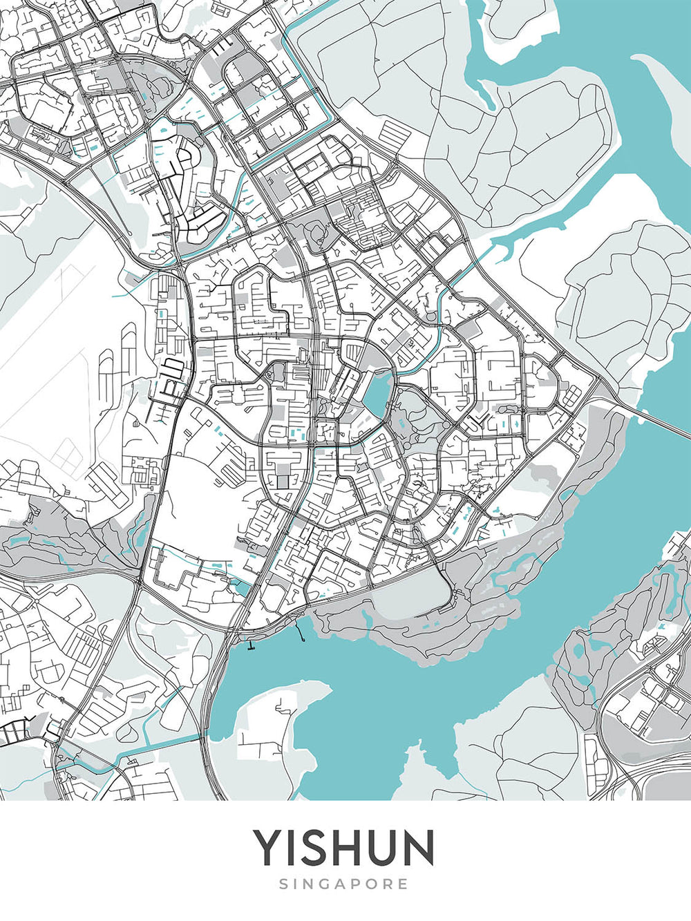 En el vecindario de Yishun, se encuentra una encantadora mezcla de belleza natural y conveniencia urbana, aspectos que se subrayan sutilmente en el diseño de este mapa. La inclusión de hitos significativos como el Hospital Khoo Teck Puat y el Parque Lower Seletar Reservoir ofrece un guiño a las diversas ofertas del vecindario. Estos hitos no se representan con palabras, sino con cuidadosas distinciones cartográficas que invitan al espectador a una inspección más cercana, convirtiendo el mapa tanto en una herramienta de descubrimiento como en un elemento decorativo. La abstracción artística del mapa invita a la imaginación sobre lo que cada área tiene para ofrecer, convirtiendo una simple mirada a una pared en un momento de exploración urbana.