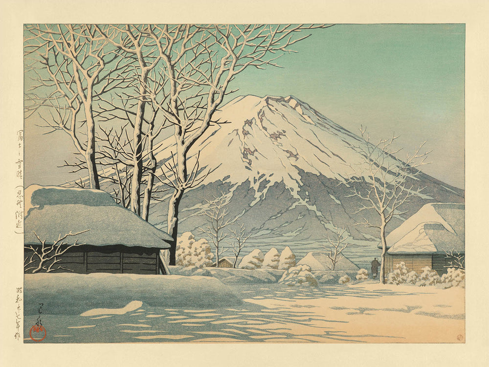 La importancia de Hasui Kawase radica en su capacidad para mezclar el arte japonés tradicional con técnicas impresionistas occidentales, creando un puente entre dos mundos artísticos. Esta pieza en particular, El Monte Fuji después de la nieve en Oshiono, es notable por su serena representación de la icónica montaña de Japón envuelta en la pureza de la nieve recién caída, utilizando la interacción de color y luz para evocar un sentido de paz. Se cree que el título japonés original de esta obra de arte es "富士の雪晴れ", que se traduce como "Monte Fuji tras una nevada".
