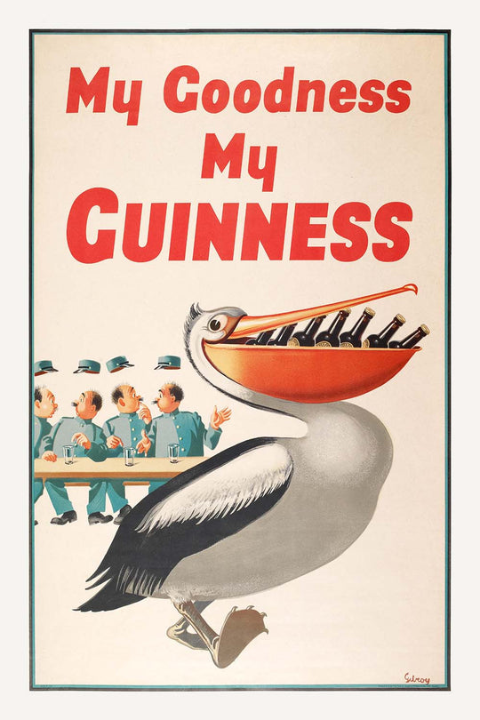 Step into the whimsical world of vintage advertising with "My Goodness my Guinness" by John Gilroy, originally published in 1939. This iconic colour lithograph poster was created to promote Guinness and features the artist’s signature sense of humour and lively character design. The scene is instantly captivating: a brightly plumed toucan cleverly balances and removes bottles of Guinness from its beak, while a row of uniformed, wide-eyed French soldiers look on in astonishment. The playful composition is crowned by the famous slogan, “My Goodness my Guinness,” which has become synonymous with the brand’s rich history.