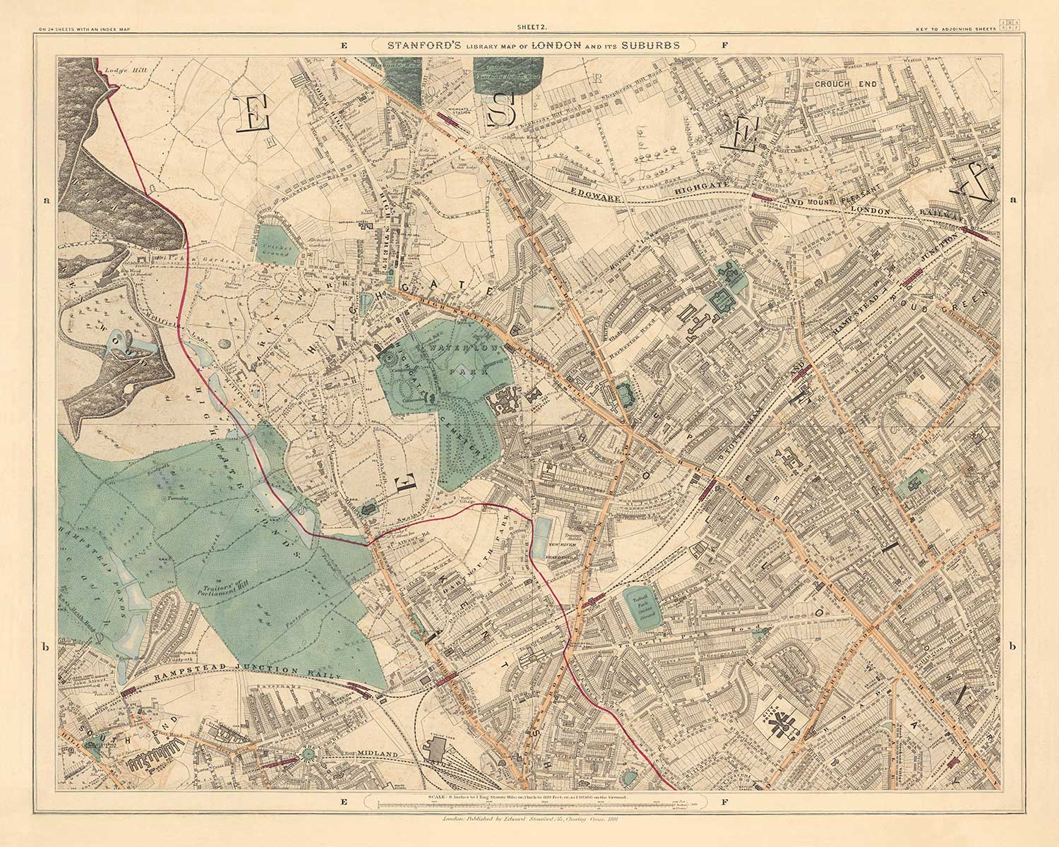 El mapa se publicó originalmente en 24 hojas. En total, el mapa habría medido aproximadamente 2 metros de ancho (78 pulgadas). Este aquí es la hoja 2, que se centra en Highgate y los distritos del norte de Londres de Camden, Haringey e Islington.