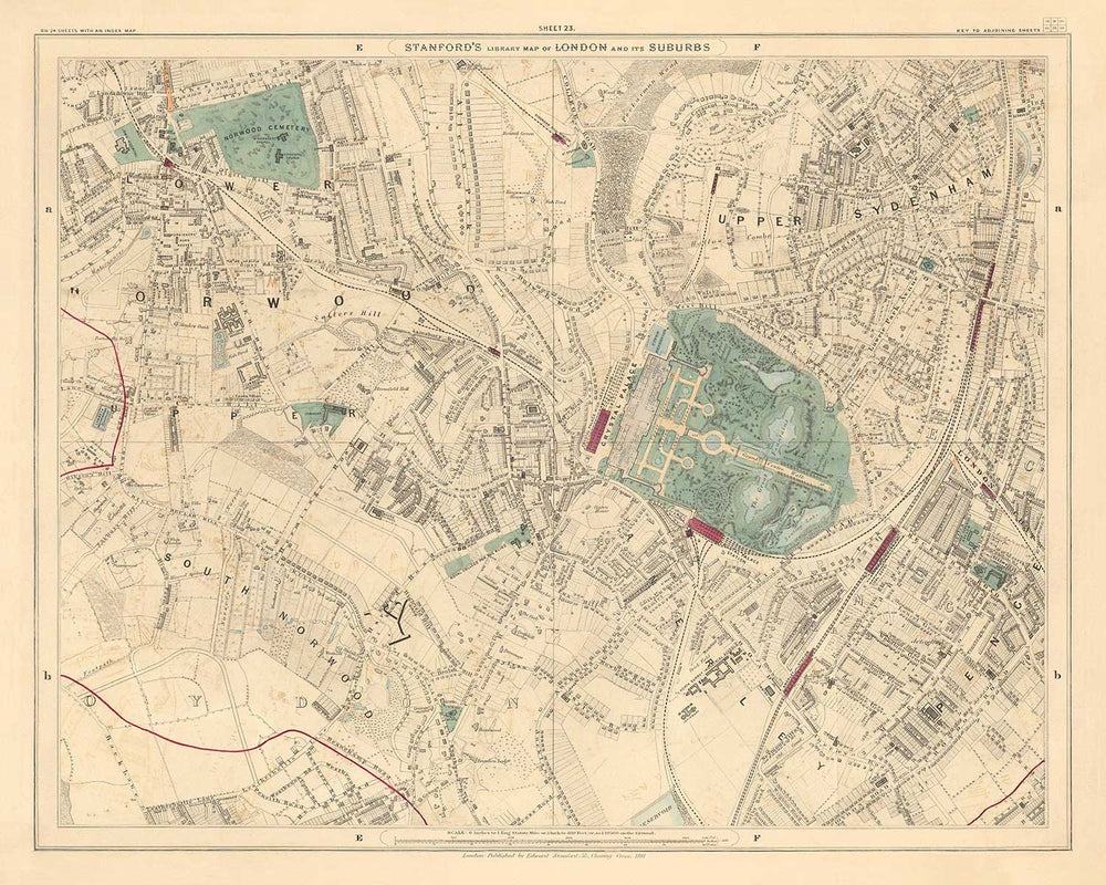 El mapa se publicó originalmente en 24 hojas. En total, el mapa habría medido aproximadamente 2 metros de ancho (78 pulgadas). Este aquí es la hoja 23, que se centra en los distritos del sureste de Londres: Croydon, Bromley, Lambeth, Lewisham y Southwark.