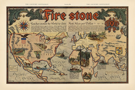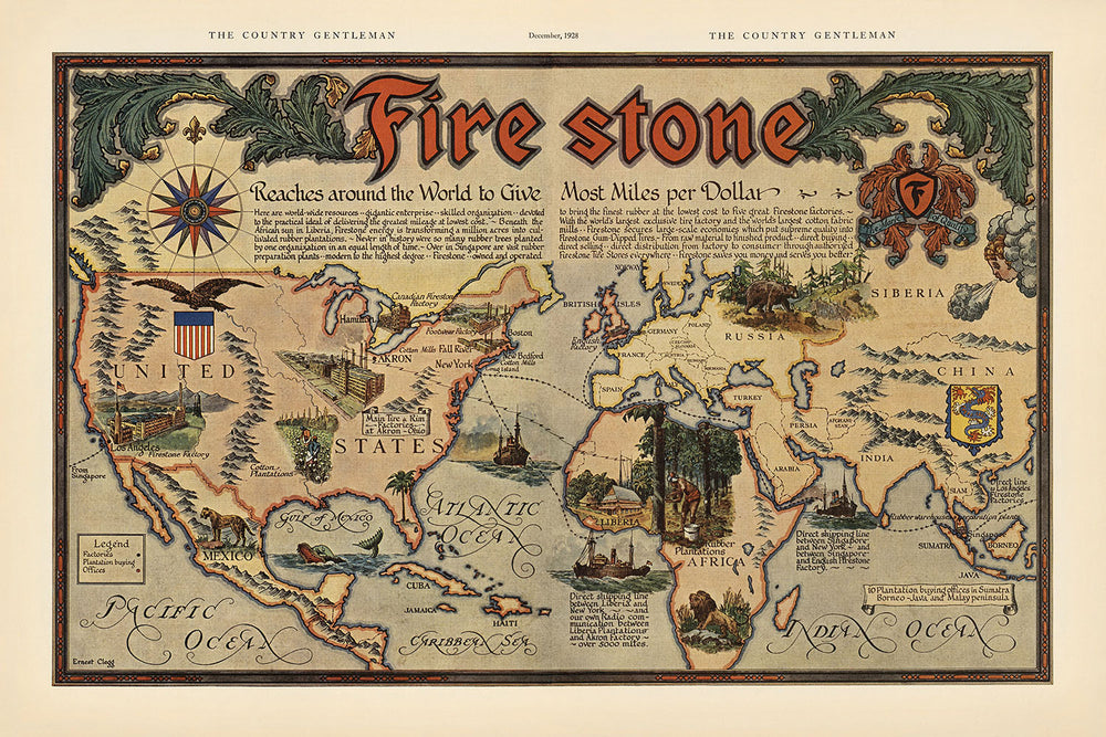Mapa Mundial de Neumáticos Firestone Antiguos por Clegg, 1928: Alcance Global, Escenas Industriales