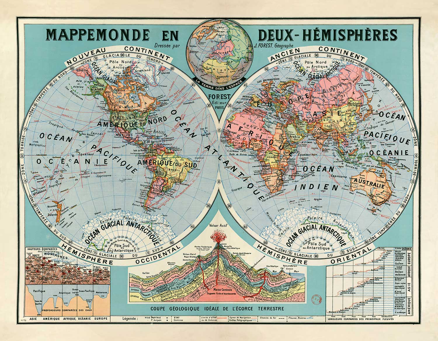 Antiguo mapamundi francés del doble hemisferio en 1925 por Joseph Forest: Volcanes, montañas, fondos marinos