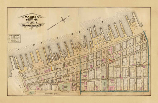Antiguo mapa de Battery Park City y Tribeca, 1879: Centro de Manhattan Wards NYC, Río Hudson, Broadway, Greenwich St, West St